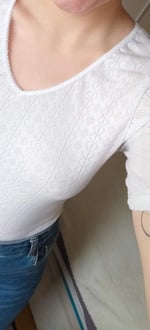 Camiseta blanca de manga corta, escote de pico con elástico.