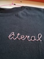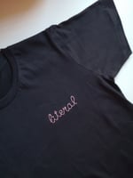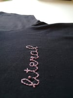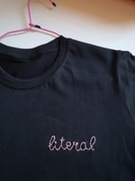 Camiseta negra con letras bordadas a mano en el color que tú quieras. SÓLO UNA PALABRA, MÁXIMO 10 LETRAS. Indica la palabra y el color en NOTES al finalizar tu pedido. Si tienes cualquier duda escribe a [email protected]