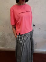 Camiseta de talle corto y holgado para mujer con manga corta. Cuello redondo con ribete ancho en canalé 1x1. Cubrecosturas reforzado a tono.